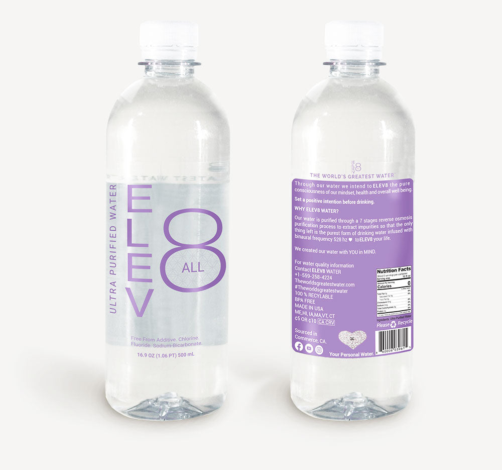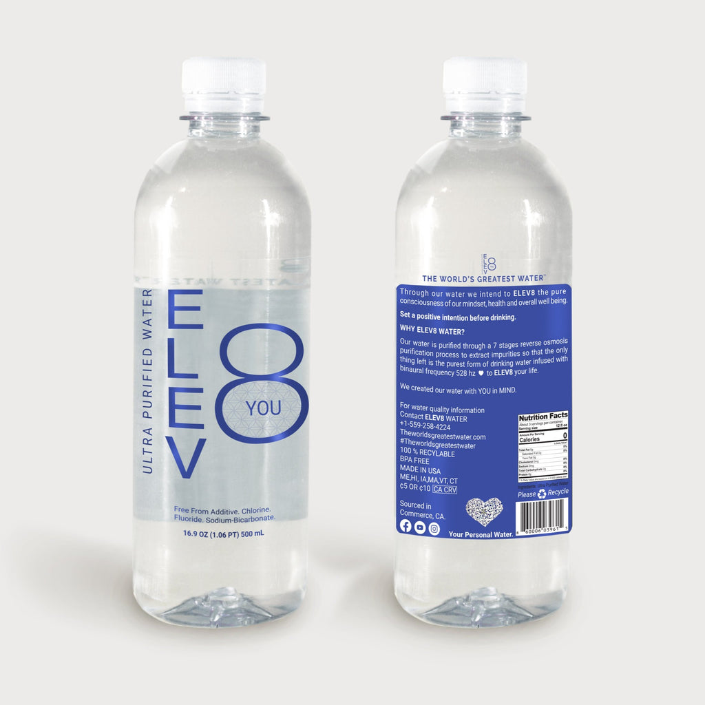 Through our water, we intend to ELEV8 the pure consciousness of our mindset, health, and overall well-being. Our water is ultra-purified through a 7-stage Deionized purification System to extract impurities so that the only thing left is the purest form of drinking water infused with binaural frequency 528 Hz ❤️ to ELEV8 your life.